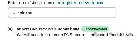 输入你的域名,下方选择默认的“Import DNS records automatically”,点击页面下方的“Continue”