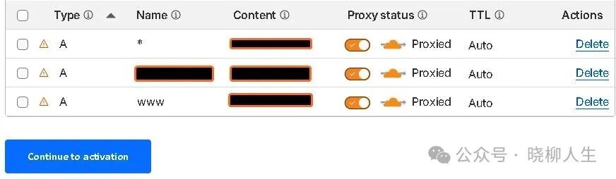 cloudflare自动导入你在阿里云那边的DNS记录,检查下是否完整。Proxy status显示“Proxied”,表示已隐藏你的真实IP。点击“continue to activation”: