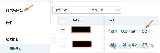 登录到阿里云的“域名与网站”控制台,选择“管理”: