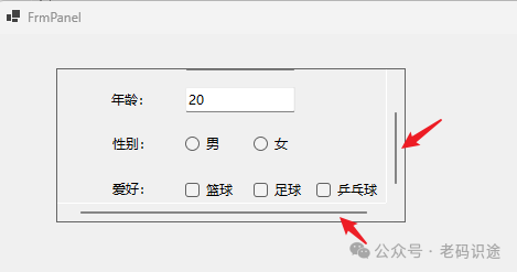 如果Panel中子控件的位置大于Panel控件的大小,默认是会自动裁切,不显示滚动条;如果需要显示滚动条,则需要设置AutoScroll属性为true,如下所示: