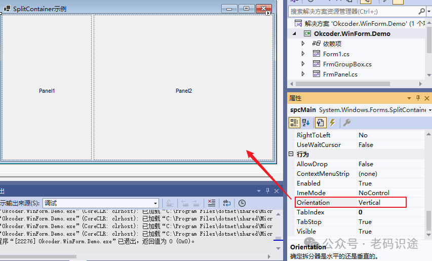 在Form窗体中,默认添加的SplitContainer控件,会自动填充到当前Form窗体中,所以默认Dock属性为Fill。SplitContainer容器的默认Orientation属性为Vertical,创建左右布局,如下所示: