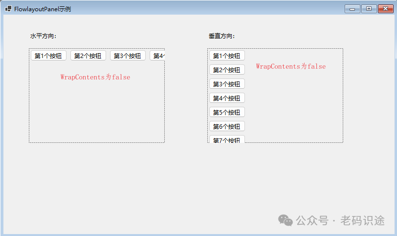 FlowLayoutPanel控件按水平或垂直流方向排列其内容。 当行宽或列高不足以显示它的内容时,它的内容可以从一行换到下一行,或从一列换到下一列; 或者,可以剪切其内容,而不是进行换行。