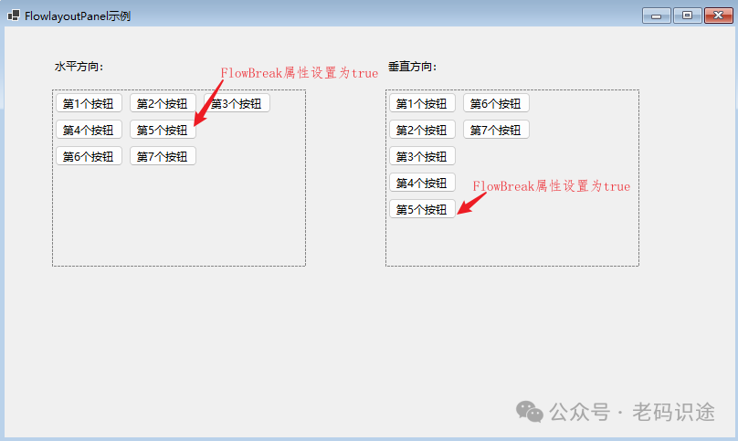 在Visual Studio设计器中,FlowLayoutPanel会显示虚线边框,但是在运行起来后,默认并不显示边框。如果要显示边框,可以设置BorderStyle属性,具体可参考Panel设置边框。FlowLayoutPanel容器中的子控件会默认具有FlowBreak属性,默认为false,如果设置为true,则从当前控件中断流式布局,并从下一个控件新开启一行或列,如将第5个按钮的FlowBreak属性设置为true,效果如下所示: