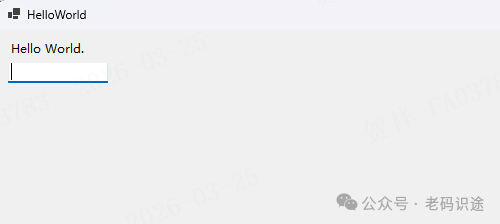 private void Form1_Load(object sender, EventArgs e){Label label1 = new Label(){Text = "Hello World.",Location = new Point(10, 10),TabIndex = 10};TextBox textBox1 = new TextBox(){Location = new Point(10,30),Width=100,Height=20,TabIndex = 11};this.Controls.Add(label1);this.Controls.Add(textBox1);}