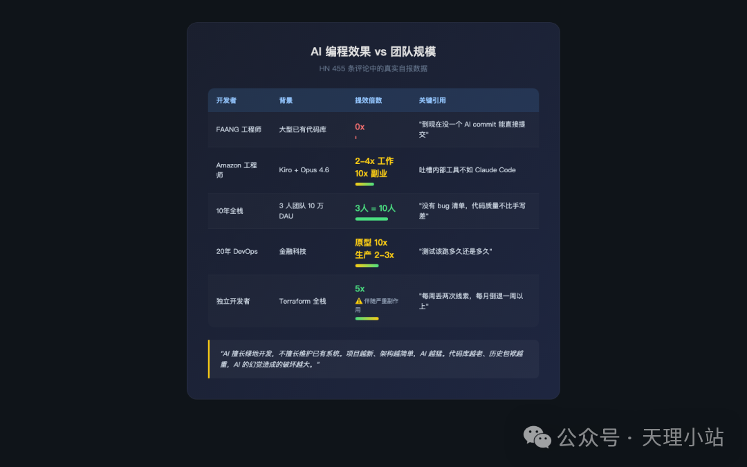 HN 455 条评论里最出乎意料的发现:AI 编程的效果跟团队规模严重相关,而且几乎是反过来的。