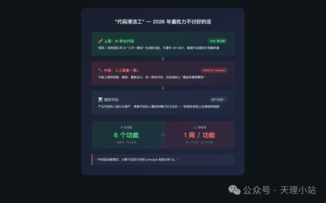 "领导对事故的态度是'那就写更好的代码'……确实,AI 写的代码有问题、漏掉业务需求。但在产品团队眼里?这不就是跟工程师打交道的日常嘛,他们根本分不出区别。"