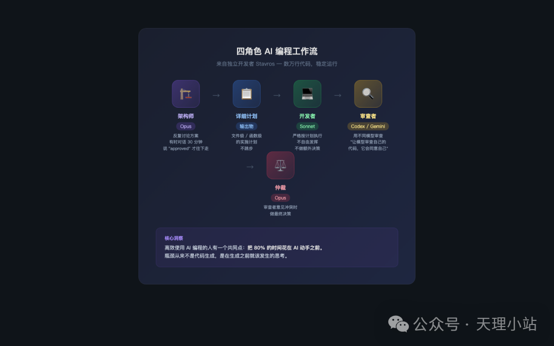 独立开发者 Stavros 在博客上分享了他的工作流——用 AI 构建了多个产品,数万行代码,稳定运行。秘诀不是"更好的 prompt",是一套四角色分工: