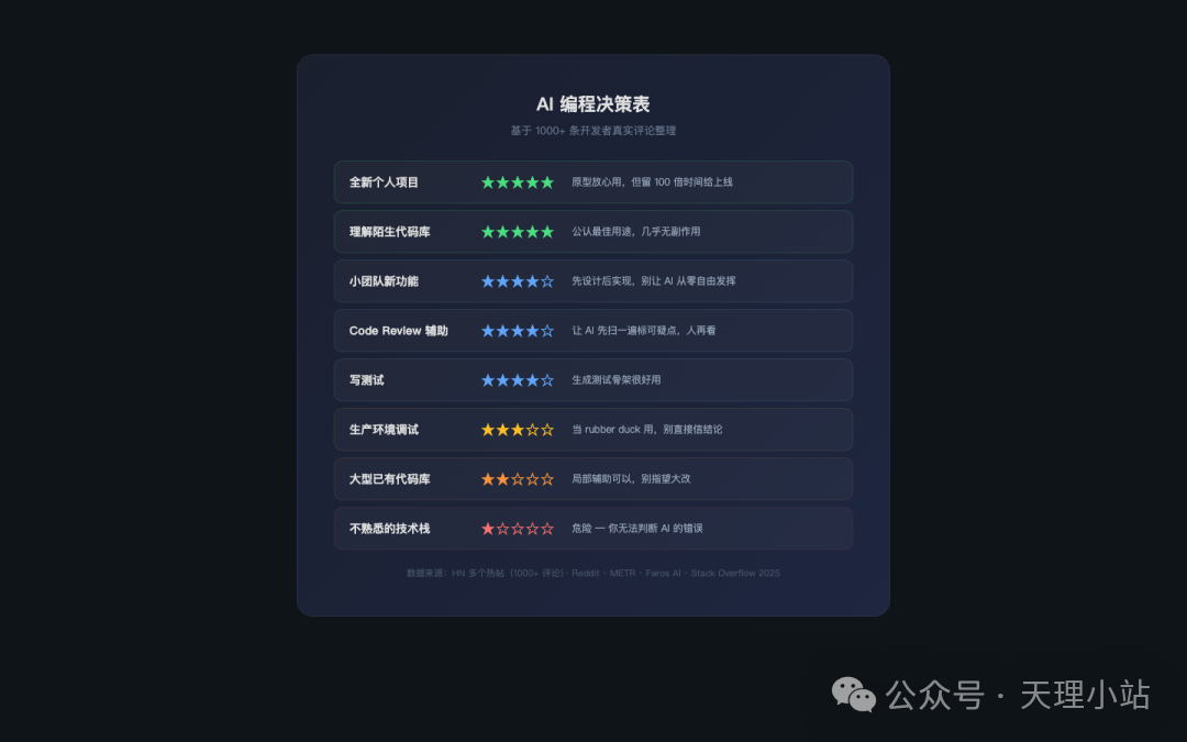 | 不熟悉的技术栈 | ⭐ | 危险——你无法判断 AI 的错误 |