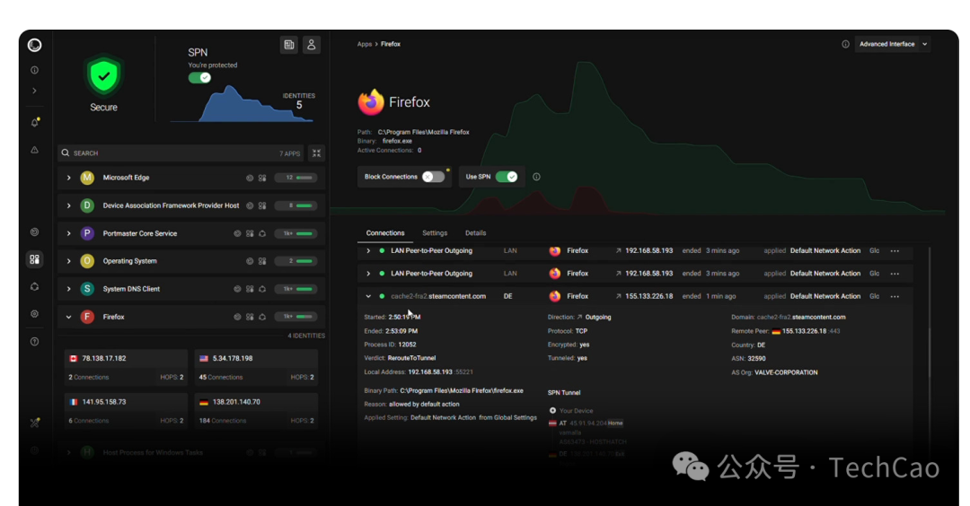 安装 Portmaster 后,你电脑里所有软件的网络底裤,都被彻底扒光了。它不是那种枯燥的命令行。打开它的控制面板,你能极其直观地看到:微信连了多少个节点,Chrome 消耗了多少流量,甚至某个你以为已经关闭的国产下载软件,还在后台偷偷连接着几十个 P2P 节点疯狂上传你的带宽。一切在暗处涌动的数据流,全部被明码标价地展示在明处。