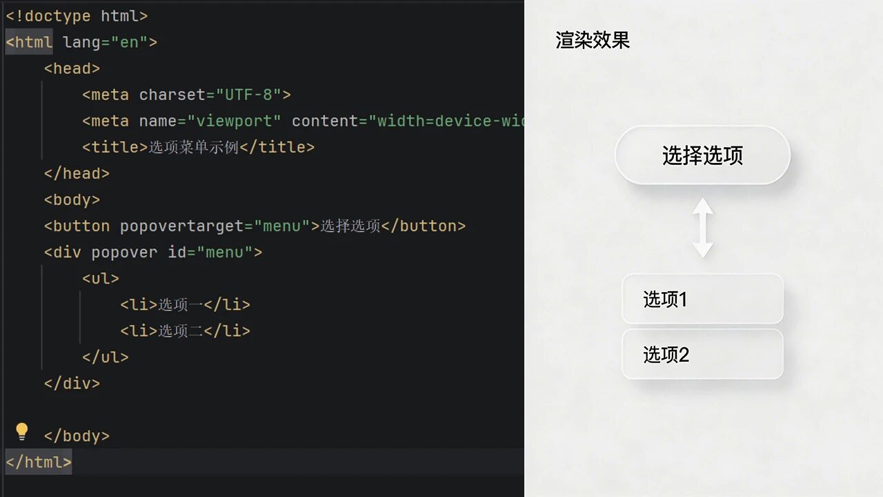 <button popovertarget="menu">打开菜单</button><div popover id="menu"> <ul> <li>选项一</li> <li>选项二</li> </ul></div>