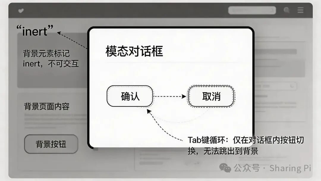 使页面其他元素inert:用户无法通过点击或Tab键离开对话框。