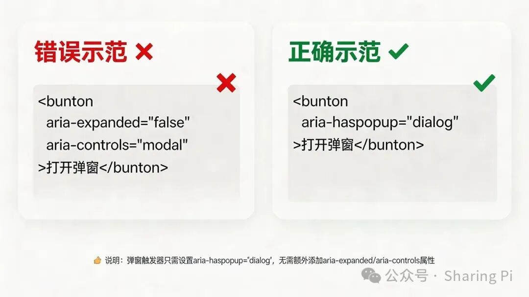 ❌在触发器上使用aria-expanded:这个属性用于展开/折叠后焦点不移动的组件(如手风琴)。对于打开对话框的按钮,正确属性是 aria-haspopup="dialog"。