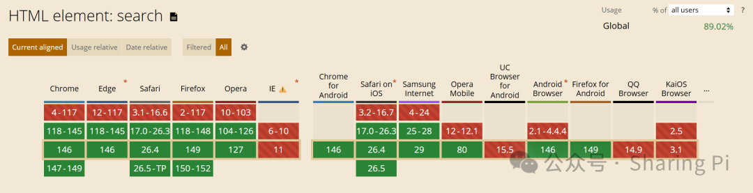 建议访问 Can I Use 网站,以及时了解 search 元素在各类浏览器中的最新兼容性支持情况。下图数据截至 2026.04.10。
