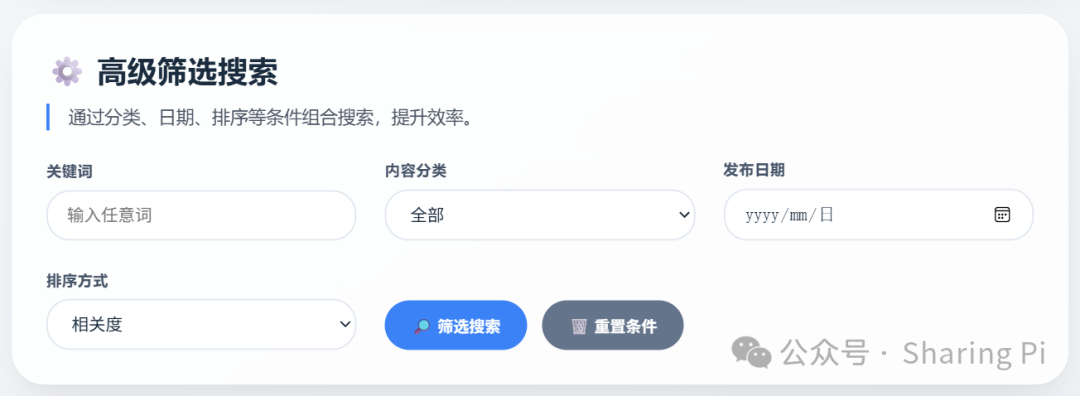 <search> <h2>高级搜索</h2> <form action="/advanced-search" method="get"> <div> <label for="adv-keyword">关键词:</label> <input type="search" id="adv-keyword" name="keyword" placeholder="多个词用空格隔开"> </div> <div> <label for="category">分类:</label> <select id="category" name="category"> <option value="">全部</option> <option value="articles">文章</option> <option value="products">产品</option> <option value="help">帮助文档</option> </select> </div> <div> <label for="date">发布日期:</label> <input type="date" id="date" name="date"> </div> <div> <label for="sort">排序:</label> <select id="sort" name="sort"> <option value="relevance">相关度</option> <option value="date">日期</option> </select> </div> <button type="submit">开始搜索</button> <button type="reset">重置条件</button> </form></search>