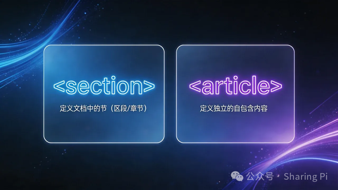 <article> 适用于 独立完整的内容单元,具备可重用、可分发特性。