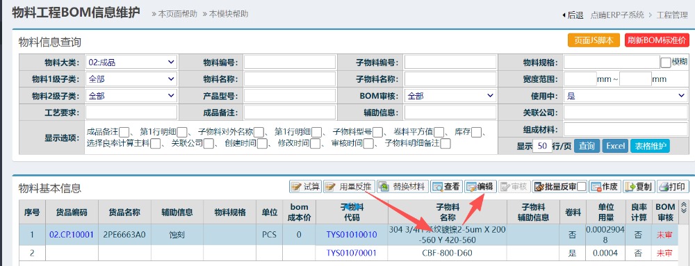 进入界面后,选中未制作bom的成品明细,选中后(任意点击栏位,背景颜色变化即为选中),点击编辑按钮