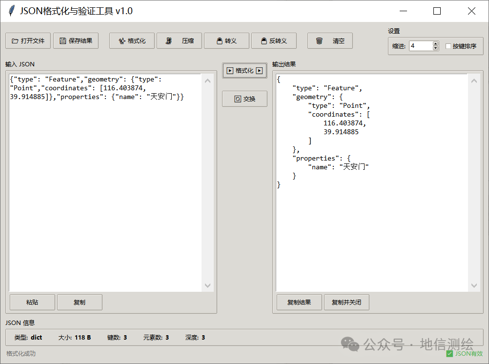 JSON(JavaScript Object Notation)是一种轻量级、文本格式的数据交换语言,独立于编程语言,易于人阅读编写,也易于机器解析生成,广泛用于前后端数据传输、配置文件、接口返回等场景。 GeoJSON 就是专门用来存「地图、位置、地理数据」的 JSON 格式,是 GIS、Web 地图、前端地图开发里最常用的矢量数据格式。可以理解为: 支持JSON格式化、JSON验证、JSON压缩、字符串转义。JSON 是什么