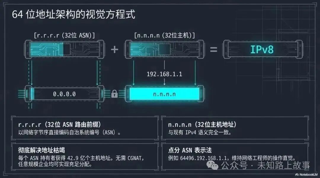 前 32 位叫 r.r.r.r,存的是 ASN 编号,也就是自治系统号,你可以理解成"这个地址属于哪个网络运营商/机构"。后 32 位叫 n.n.n.n,存的是主机地址,语义跟 IPv4 完全一样。
