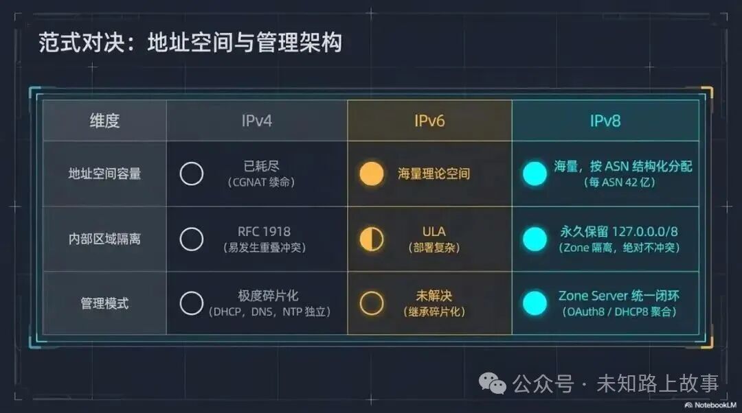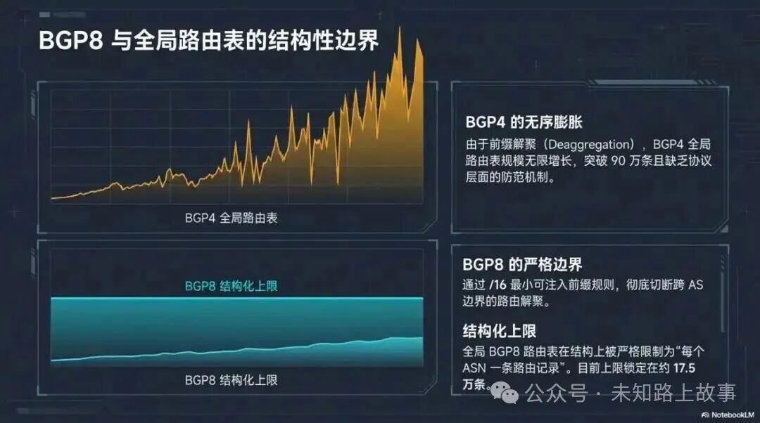 现在 BGP4 的全球路由表已经超过 90 万条前缀,而且没有上限,会一直涨。IPv8 的解法是:把路由前缀和 ASN 强绑定,同时规定最小只能注入 /16 的前缀,不能拆得更细。理论上全球路由表的规模就等于 ASN 的数量,目前大概 17.5 万条,比现在少多了。