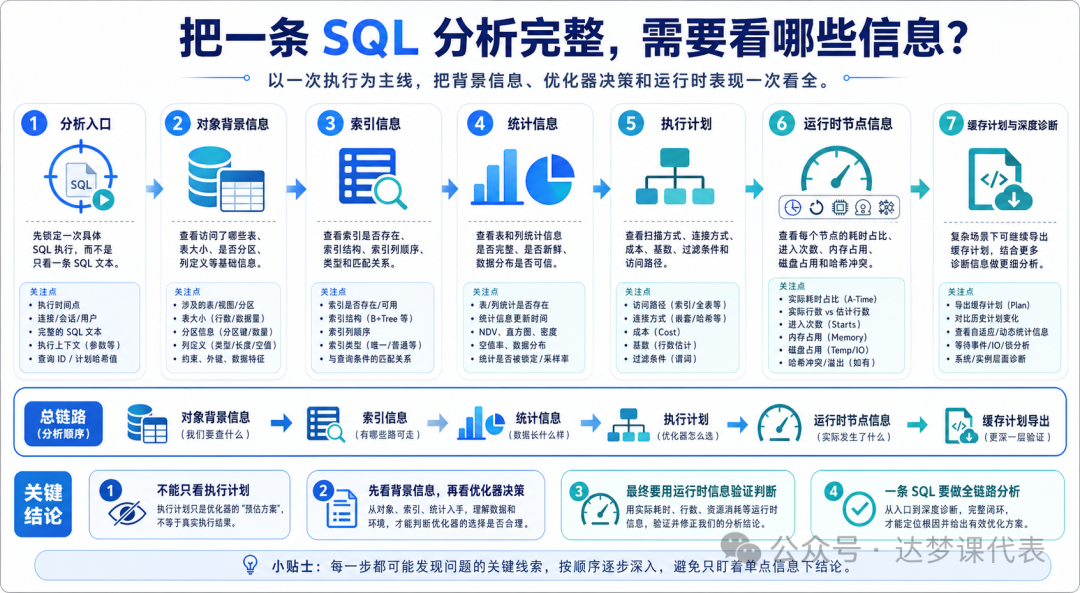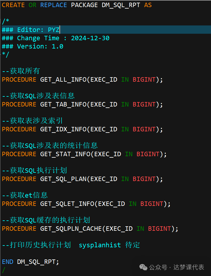 很多时候我们拿到一条执行慢、结果异常或者资源消耗偏高的SQL,第一反应都是先去看执行计划。但真正分析下来就会发现,执行计划只是其中一块信息。 还需要知道这条SQL实际访问了哪些表,表本身有多大,是不是分区表,表上有哪些索引,统计信息是不是过旧,执行过程中时间到底耗在了哪个节点上,必要的时候甚至还要把缓存中的执行计划导出来继续看。少看一块,判断就可能偏。 02 — DM_SQL_RPT包 基于上述原因,DM_SQL_RPT是一个达梦的PACKAGE包,通过每个功能封装存储过程的形式,把原本分散的分析动作做成了一套固定流程。 核心思路:通过SQL语句执行后返回的EXEC_ID,去收集对象、索引、统计信息、执行计划、运行时节点信息以及缓存计划。尽量把和这次执行有关的关键视角一次性收集输出。 03 — 具体模块说明 DM_SQL_RPT目前包含六个采集模块,分别负责表信息、索引信息、统计信息、执行计划、ET 节点运行信息以及缓存执行计划导出。 1. 表信息模块:先通过V$SQL_HISTORY和 V$SQL_PLAN结合EXEC_ID找到本次执行关联到的对象ID,再回到SYSOBJECTS里把对象解析成schema 和表名。定位表后获取对用的列定义、表的统计信息、区分表等相关数据。 2. 索引信息模块:先从V$SQL_HISTORY和V$SQL_PLAN找到当前 SQL 涉及的表,再通过SYSOBJECTS、SYSINDEXES、SYSCOLUMNS去展开这些表上的索引信息。 3. 统计信息模块:先通过V$SQL_HISTORY和 V$SQL_PLAN锁定目标表,再从SYSSTATS结合SYSOBJECTS、SYSCOLUMNS去取列级统计信息。如果表上没有可用统计信息,会提示为空。 4. 执行计划模块:先通过V$SQL_HISTORY和V$SQL_PLAN找到对应的 SQL_ID和计划地址,再从V$SQL_PLAN_NODE把节点级信息取出来,按层级重新组织成一棵便于阅读的计划树。 5. ET节点运行信息模块:直接读取V$SQL_NODE_HISTORY和V$SQL_NODE_NAME,把每个节点的耗时、耗时占比、进入次数、内存占用、磁盘占用以及哈希使用和冲突情况整理出来。 6. 缓存执行计划导出:通过V$CACHEPLN、V$SQL_PLAN和 V$SQL_HISTORY把本次执行关联到缓存计划项,再通过V$DM_INI读取 TRACE_PATH,把缓存中的执行计划导出到 trace 文件里。 04 — 使用示例 提供的这个示例即为完整过程 1. 将脚本的SQL语句放到数据库中执行 2. disql工具中开启MONITOR_SQL_EXEC参数 3. 开启set serveroutput on 4. 执行慢SQL 5. 执行脚本中包的功能函数 此时会输出SQL的关联表的信息以及表字段和表的索引信息。最下面就是SQL的执行计划以及ET信息。