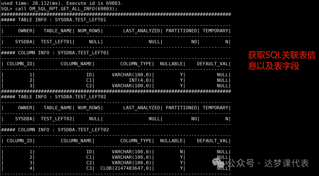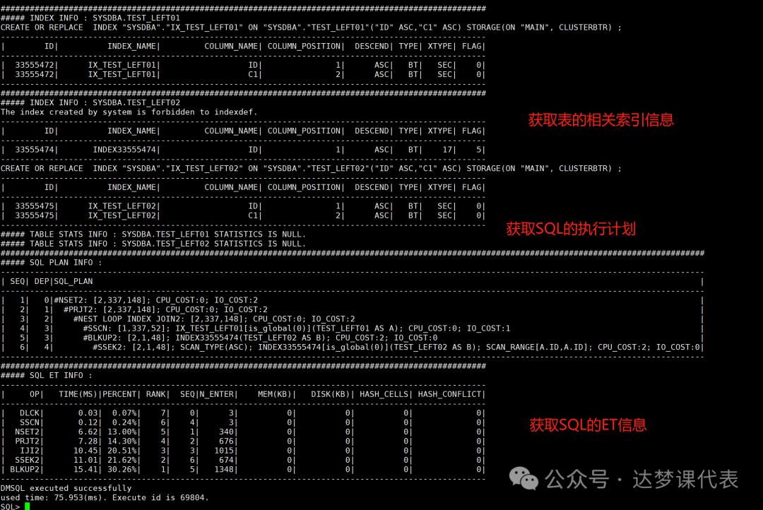 --disql登录,创建包后,开启 MONITOR_SQL_EXECSQL> SF_SET_SESSION_PARA_VALUE ('MONITOR_SQL_EXEC', 1);DMSQL executed successfullyused time: 0.752(ms). Execute id is 69801.--开启 set serveroutput on SQL> set serveroutput on--执行问题SQL SQL> select a.id,a.c1,b.c1 from test_left01 a join test_left02 b on a.id=b.id;used time: 28.112(ms). Execute id is 69803.--获得 SQL执行ID,调用脚本的存储过程"获取所有" SQL> call DM_SQL_RPT.GET_ALL_INFO(69803); ###################################################################################### TABLE INFO : SYSDBA.TEST_LEFT01---------------------------------------------------------------------------------| OWNER| TABLE_NAME| NUM_ROWS| LAST_ANALYZED| PARTITIONED| TEMPORARY|---------------------------------------------------------------------------------| SYSDBA| TEST_LEFT01| NULL| NULL| NO| N|---------------------------------------------------------------------------------##### COLUMN INFO : SYSDBA.TEST_LEFT01---------------------------------------------------------------------------------| COLUMN_ID| COLUMN_NAME| COLUMN_TYPE| NULLABLE| DEFAULT_VAL|---------------------------------------------------------------------------------| 1| ID| VARCHAR(100,0)| Y| NULL|| 2| C1| INT(4,0)| Y| NULL|| 3| C2| VARCHAR(100,0)| Y| NULL|###################################################################################### TABLE INFO : SYSDBA.TEST_LEFT02---------------------------------------------------------------------------------| OWNER| TABLE_NAME| NUM_ROWS| LAST_ANALYZED| PARTITIONED| TEMPORARY|---------------------------------------------------------------------------------| SYSDBA| TEST_LEFT02| NULL| NULL| NO| N|---------------------------------------------------------------------------------##### COLUMN INFO : SYSDBA.TEST_LEFT02---------------------------------------------------------------------------------| COLUMN_ID| COLUMN_NAME| COLUMN_TYPE| NULLABLE| DEFAULT_VAL|---------------------------------------------------------------------------------| 1| ID| VARCHAR(100,0)| N| NULL|| 2| C1| VARCHAR(100,0)| Y| NULL|| 3| C2| VARCHAR(100,0)| Y| NULL|| 4| C3| CLOB(2147483647,0)| Y| NULL|---------------------------------------------------------------------------------######################################################################################################### INDEX INFO : SYSDBA.TEST_LEFT01CREATE OR REPLACE INDEX "SYSDBA"."IX_TEST_LEFT01" ON "SYSDBA"."TEST_LEFT01"("ID" ASC,"C1" ASC) STORAGE(ON "MAIN", CLUSTERBTR) ;----------------------------------------------------------------------------------------------------| ID| INDEX_NAME| COLUMN_NAME| COLUMN_POSITION| DESCEND| TYPE| XTYPE| FLAG|----------------------------------------------------------------------------------------------------| 33555472| IX_TEST_LEFT01| ID| 1| ASC| BT| SEC| 0|| 33555472| IX_TEST_LEFT01| C1| 2| ASC| BT| SEC| 0|----------------------------------------------------------------------------------------------------######################################################################################################### INDEX INFO : SYSDBA.TEST_LEFT02The index created by system is forbidden to indexdef.----------------------------------------------------------------------------------------------------| ID| INDEX_NAME| COLUMN_NAME| COLUMN_POSITION| DESCEND| TYPE| XTYPE| FLAG|----------------------------------------------------------------------------------------------------| 33555474| INDEX33555474| ID| 1| ASC| BT| 17| 5|----------------------------------------------------------------------------------------------------CREATE OR REPLACE INDEX "SYSDBA"."IX_TEST_LEFT02" ON "SYSDBA"."TEST_LEFT02"("ID" ASC,"C1" ASC) STORAGE(ON "MAIN", CLUSTERBTR) ;----------------------------------------------------------------------------------------------------| ID| INDEX_NAME| COLUMN_NAME| COLUMN_POSITION| DESCEND| TYPE| XTYPE| FLAG|----------------------------------------------------------------------------------------------------| 33555475| IX_TEST_LEFT02| ID| 1| ASC| BT| SEC| 0|| 33555475| IX_TEST_LEFT02| C1| 2| ASC| BT| SEC| 0|----------------------------------------------------------------------------------------------------##### TABLE STATS INFO : SYSDBA.TEST_LEFT01 STATISTICS IS NULL.##### TABLE STATS INFO : SYSDBA.TEST_LEFT02 STATISTICS IS NULL.###################################################################################################################################################### SQL PLAN INFO :-------------------------------------------------------------------------------------------------------------------------------------------------| SEQ| DEP|SQL_PLAN |-------------------------------------------------------------------------------------------------------------------------------------------------| 1| 0|#NSET2: [2,337,148]; CPU_COST:0; IO_COST:2 || 2| 1| #PRJT2: [2,337,148]; CPU_COST:0; IO_COST:2 || 3| 2| #NEST LOOP INDEX JOIN2: [2,337,148]; CPU_COST:0; IO_COST:2 || 4| 3| #SSCN: [1,337,52]; IX_TEST_LEFT01[is_global(0)](TEST_LEFT01 AS A); CPU_COST:0; IO_COST:1 || 5| 3| #BLKUP2: [2,1,48]; INDEX33555474(TEST_LEFT02 AS B); CPU_COST:2; IO_COST:0 || 6| 4| #SSEK2: [2,1,48]; SCAN_TYPE(ASC); INDEX33555474[is_global(0)](TEST_LEFT02 AS B); SCAN_RANGE[A.ID,A.ID]; CPU_COST:2; IO_COST:0|-------------------------------------------------------------------------------------------------------------------------------------------------######################################################################################################### SQL ET INFO :----------------------------------------------------------------------------------------------------| OP| TIME(MS)|PERCENT| RANK| SEQ|N_ENTER| MEM(KB)| DISK(KB)| HASH_CELLS| HASH_CONFLICT|----------------------------------------------------------------------------------------------------| DLCK| 0.03| 0.07%| 7| 0| 3| 0| 0| 0| 0|| SSCN| 0.12| 0.24%| 6| 4| 3| 0| 0| 0| 0|| NSET2| 6.62| 13.00%| 5| 1| 340| 0| 0| 0| 0|| PRJT2| 7.28| 14.30%| 4| 2|