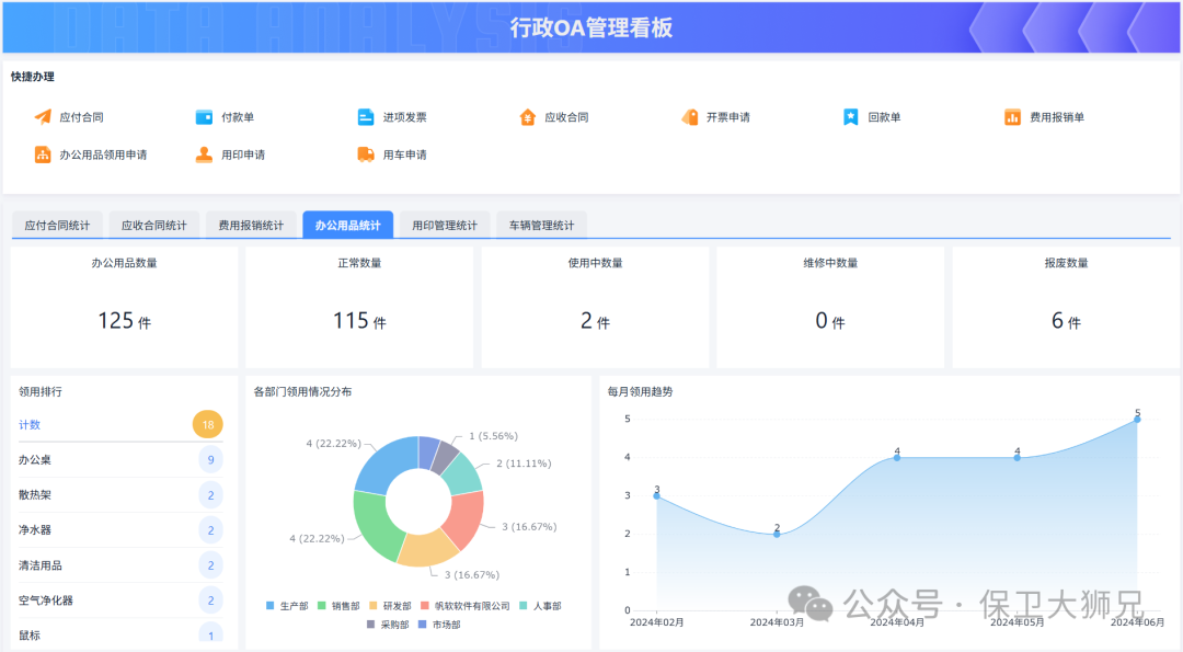 4 业务系统缺位,OA被迫承担业务入口 不少企业并不是一开始就设计好系统架构,而是随着业务发展不断叠加工具。结果就是: 没有CRM,用OA记录客户 没有进销存,用OA做库存 没有项目系统,用OA跟进进度 短期看是解决了问题,但长期来看,OA开始承载本不属于它的业务逻辑,数据分散、重复填写、信息断层,这些问题都会出现。 我之前接触过一家企业,所有行政、报销、物资领用都放在一个传统OA里,但实际使用中,员工最头疼的不是流程本身,而是: 同一份信息要填好几次 审批和实际业务脱节 数据无法沉淀下来做分析 后来他们只能把各类流程重新梳理,用像简道云这样的工具,把数据+流程放在一起。一个很明显的变化是: 报销不再是单纯审批,而是直接关联费用数据 办公用品不再是申请单,而是库存和领用一起管理 流程减少,但信息更完整 本质上,是把流程工具往业务工具方向拉了一步。