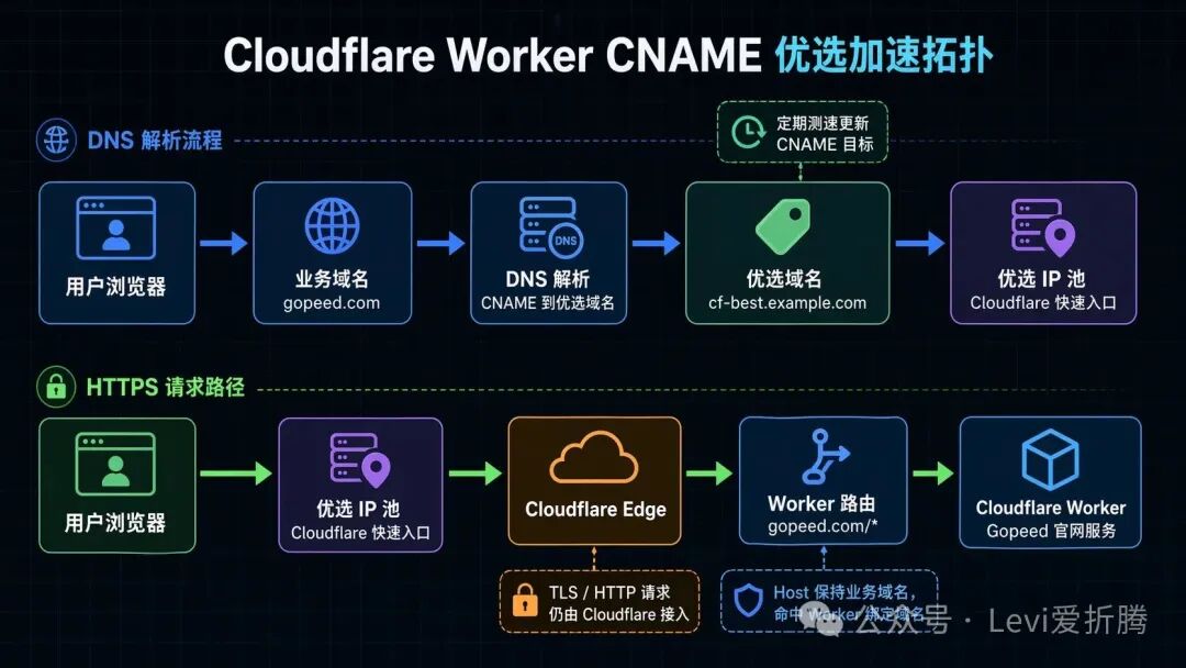 整个链路大概是下面这样,业务域名通过 CNAME 指向优选域名,优选域名再解析到当前质量更好的 Cloudflare 入口 IP,最终请求仍然由 Cloudflare Edge 接入并命中 Worker 路由。