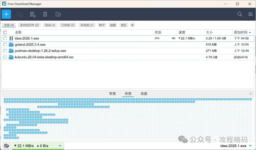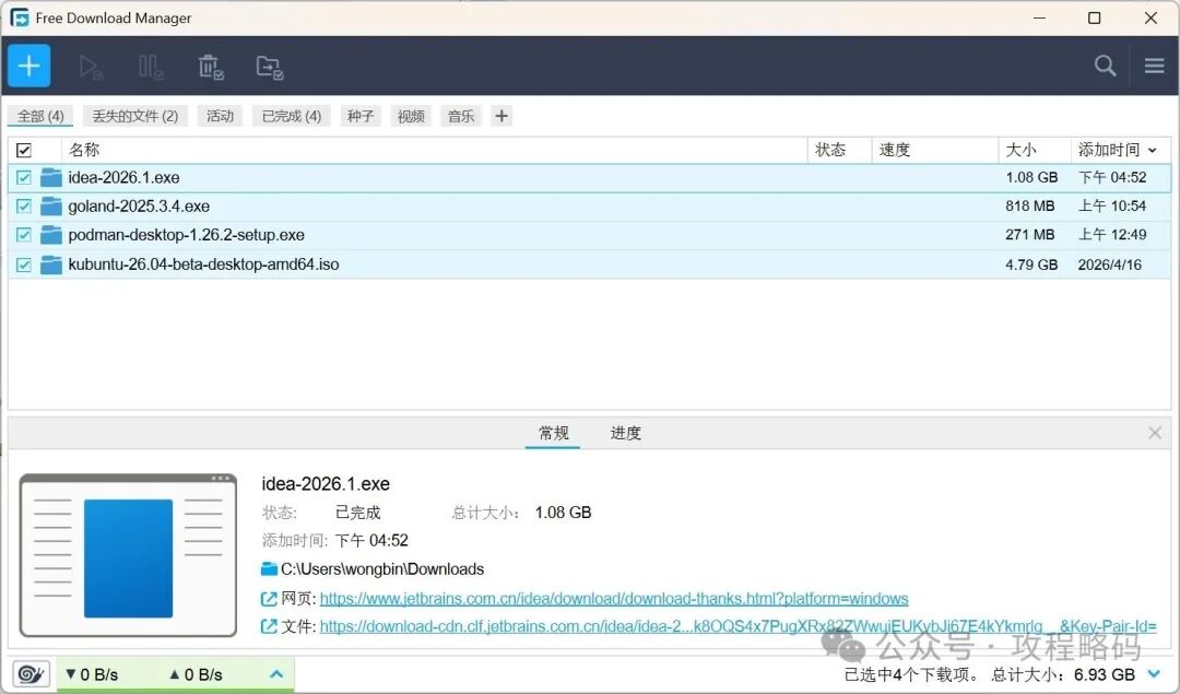 现在的插件虽然不多,但是其开源免费的特点,和众多使用者的青睐,未来应会慢慢的丰富的。在使用过一段时间后,大部分时间都挺好。但有时候下载的文件会有损坏。还有一点就是我觉得界面做的挺粗糙,或者说我不太喜欢它的界面设计。用起来不太习惯有点反人类。于是发现了新的大陆FDM。全称 Free Download Manager 从名字我们就可以知道它是一款完全免费的下载管理器,命名方式和IDM类似。没错它就是IDM最完美的替代方式,甚至在用户体验上吊打IDM。并且拥有全球庞大的用户群体。拥有现代化友好的用户界面,界面排版美观清爽没有广告。可以清晰的看到文件的来源、大小、是否支持断点续传。点击蜗牛图标,可以直接切换到慢速模式。也可以选择三种不同的限速挡位。FDM集成了IDM和Gopeed两款下载管理器的所有优点,并且具有自己的特色。支持简体中文,优美的界面,免费跨平台、支持扩展、接管浏览器、资源占用极低等,非常的好用。FDM就是迄今为止我心中最完美的多线程下载管理器。