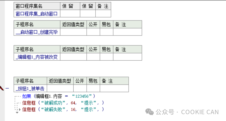这两天也是终于拾回以前一直想弄的东西但是没去弄的想法了,也就是将一个软件破解掉,这里我分享一下破解的思路叭。一个软件,总会有一些付费的功能,有一些软件就是要付费才能进去使用,有没有什么方法绕过然后直接使用功能呢,当然是有的。一个软件想要绕过然后使用其功能,肯定少不了使用之前的验证,一般验证的代码,无非就是if和else,只要找到这个关键点,我们改一下验证的逻辑,不就可以绕过软件了吗。我用易语言写了一个简单的验证软件(开始的时候是用c写的,但是黑乎乎的弹窗一瞬间没了,就不好用),如图:正确的密码是123456,但是我们事先不知道密码,那么点击按钮后,肯定是会验证错误的我们要破解一个程序,必须先知道验证的流程,一个程序大致的验证流程如下:我们可以在流程的任意一处下断点,然后往前跟或者往后跟,一直跟到验证的关键点,找到关键点之后,我们就可以实现破解。但是根据选流程的不同,那么效率也会不同,我们当然选效率更加高的点进行跟踪,也就是靠近验证关键点附近跟,在这里我就直接选择d流程中的点进行跟踪。在进行跟踪之前,我们先来学习一下什么是MessageBoxA?