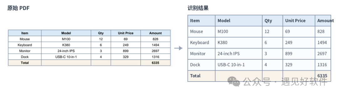 我专门拿了一页样例 PDF 跑了一遍,左边是原表格,右边是实际提取出来的结果表。